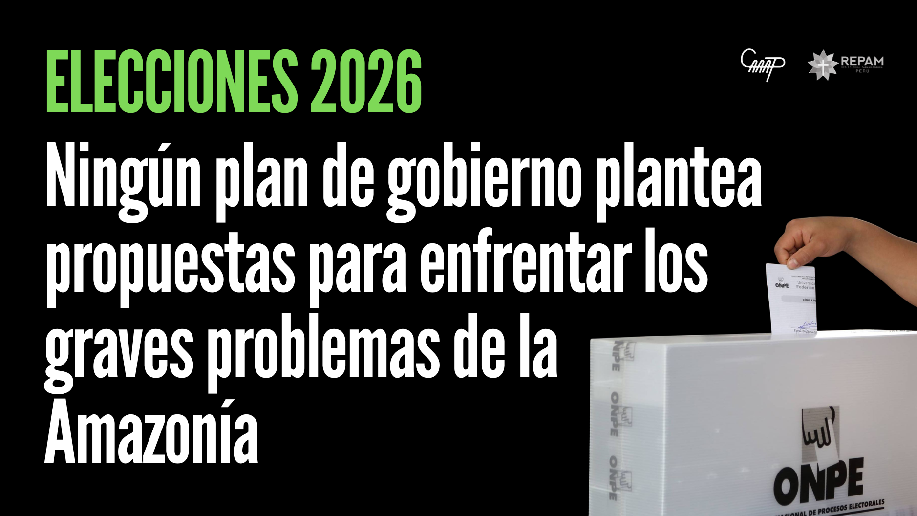 En el marco de las Elecciones Generales del 12 de abril de 2026, en las que la ciudadanía elegirá al presidente de la República, vicepresidentes y representantes ante el Congreso y el Parlamento Andino, el Centro Amazónico de Antropología y Aplicación Práctica (CAAAP) y la Red Eclesial Panamazónica del Perú (REPAM Perú) presentan tres briefings informativos que analizan cómo los planes de gobierno de los partidos políticos abordan temas clave para la Amazonía. Estos materiales buscan contribuir a un voto informado y consciente, poniendo a disposición información clara y basada en evidencia sobre la presencia, o ausencia, de propuestas relacionadas con Amazonía, pueblos indígenas, extractivismo y cambio climático y medio ambiente. Se trata de temas fundamentales para el futuro del país y, en particular, para los pueblos indígenas y otras poblaciones en situación de riesgo. El análisis fue realizado por el equipo de la Oficina de Incidencia Legal del CAAAP, a partir de una revisión de gabinete de 35 planes de gobierno presentados para estas elecciones (uno de los partidos en contienda no había publicado su plan al momento del análisis). La revisión se centró en identificar la presencia y pertinencia de propuestas vinculadas a los cuatro temas priorizados. La información fue sistematizada en una matriz comparativa que permite identificar, partido por partido, si las propuestas representan avances, menciones generales o retrocesos respecto a estándares nacionales e internacionales en materia ambiental y de derechos de los pueblos indígenas. Los resultados de esta revisión se sintetizan en tres briefings dirigidos a públicos específicos.