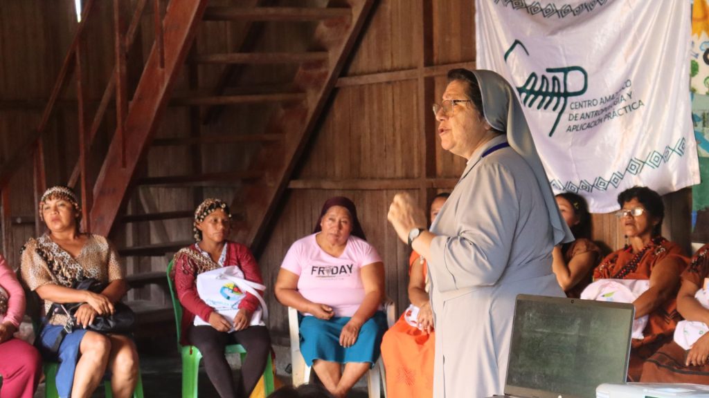 Además, la hermana Ana María Palomino Corzo mml., vicepresidenta de la REPAM Panamazónica e integrante del equipo técnico del CAAAP, desarrolló una ponencia sobre crisis climática y Amazonía, en la que abordó los impactos del cambio climático en los territorios amazónicos y sus efectos diferenciados en las mujeres y comunidades indígenas. Durante su intervención, destacó el rol fundamental de las mujeres de los pueblos indígenas en la protección del bosque, subrayando su papel como defensoras de la vida y del equilibrio de los ecosistemas.